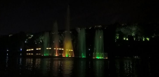 虞山脚下的音乐喷泉,赶巧,正好这个点,正好有音乐喷泉。其实观赏的人还是蛮多的~有些就靠在湖一侧的桥头上,有些就俯在湖边的小路护栏上。