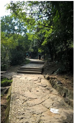走过第一个小平台,就进入了车行道(虞山上有贯通南北的车行道,游人可以乘坐巴士上山,不过毕竟是山路,崎岖不平,绕来上去,听着巴士哄着油门上坡下坡,就感觉坐车好像也不舒服,我想很多游客还是宁愿选择沿道路边上步行上山的。)